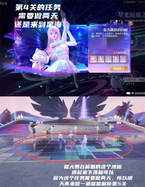 操作:來到星海大舞臺前的地板,跳起來下落,該任務需要做兩天,第二天再做一遍可解鎖第五關。